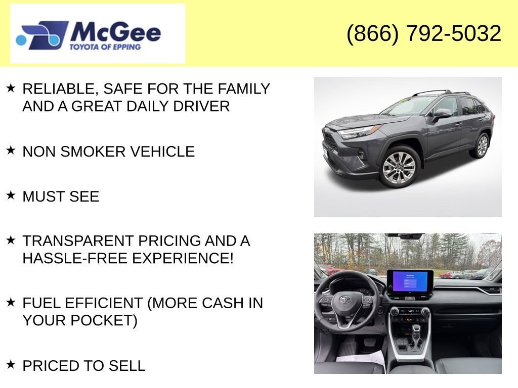 RELIABLE, SAFE FOR THE FAMILY AND A GREAT DAILY DRIVER, NON SMOKER VEHICLE, MUST SEE, TRANSPARENT PRICING AND A HASSLE-FREE EXPERIENCE!, FUEL EFFICIENT (MORE CASH IN YOUR POCKET), PRICED TO SELL, TOYOTA CERTIFICATION GIVES BUYERS PEACE OF MIND WITH A RIGOROUS 160-POINT INSPECTION, EXTENDED FACT, REMAINDER OF FACTORY WARRANTY, INCLUDES WARRANTY, CLEAN CARFAX, EXCELLENT COLOR COMBINATION, FRESH ENGINE OIL & FILTER, ROTATED & BALANCED ALL TIRES, TOYOTA CERTIFIED, 2025 Toyota RAV4 XLE Premium Elevated Comfort, Confident Performance, and Toyotas Award-Winning Reliability The 2025 Toyota RAV4 XLE Premium offers an upgraded blend of refinement, capability, and everyday practicality. Powered by a 2.5L 4-cylinder engine paired with a smooth 8-speed automatic transmission, the RAV4 XLE Premium delivers excellent fuel efficiency, strong performance, and confident handling. Available All-Wheel Drive provides added traction for snow, rain, and New England roads. Inside, the XLE Premium trim enhances comfort and style with SofTex-trimmed seating, power drivers seat with lumbar support, heated front seats (available), and premium interior finishes. A large 10.5-inch Toyota Audio Multimedia touchscreen with wireless Apple CarPlay & Android Auto, Wi-Fi Connect, Bluetooth, USB ports, and available JBL premium audio keep every drive connected and enjoyable. The elevated exterior adds 19-inch alloy wheels, LED lighting, a power moonroof, and bold RAV4 styling that stands out on any road. Versatile cargo space and 60/40 split-folding rear seats make it ideal for family life, commuting, or weekend adventure. Standard Toyota Safety Sense 2.5+ includes Pre-Collision System with Pedestrian Detection, Full-Speed Dynamic Radar Cruise Control, Lane Tracing Assist, Lane Departure Alert with Steering Assist, Road Sign Assist, and Automatic High Beamsdelivering top-tier driver confidence. With its premium comfort upgrades, advanced technology, outstanding efficiency, and renowned Toyota dependability, the 2025 RAV4 XLE Premium is one of the most compelling compact SUVs in its class., AWD, Black w/SofTex Seat Trim.