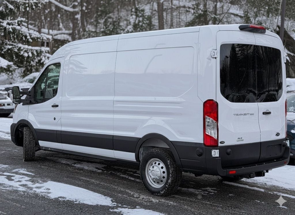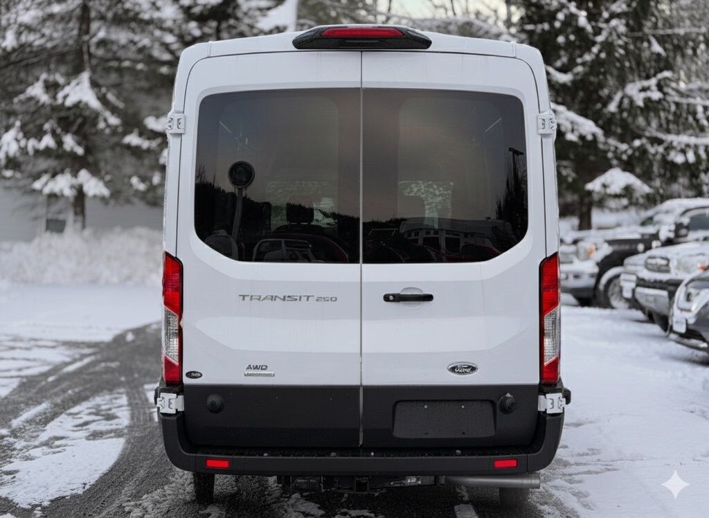 Oxford White 2025 Ford Transit-250 AWD 10-Speed Automatic with Overdrive EcoBoost 3.5L V6 GTDi DOHC 24V Twin Turbocharged Driver door bin, Exterior Parking Camera Rear, Frame Mounted Hitch Receiver, Fully automatic headlights, Heavy-Duty Trailer Tow Package, Panic alarm, Tow/Haul Mode w/Trailering Wiring Provisions.