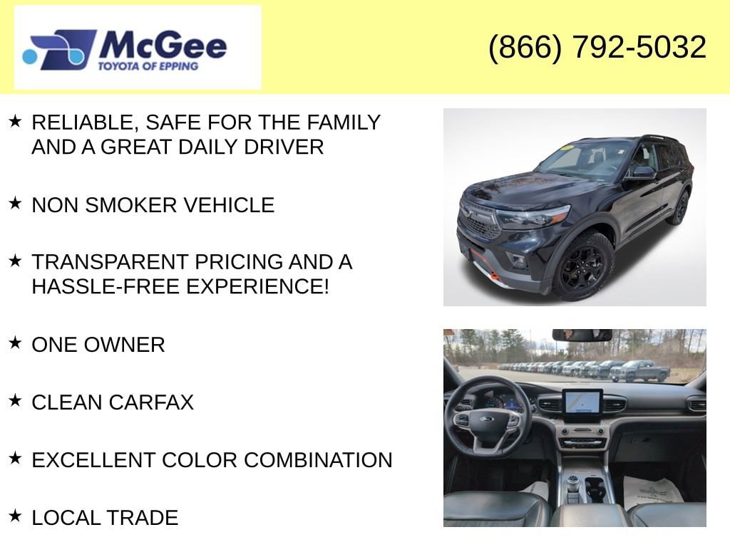 RELIABLE, SAFE FOR THE FAMILY AND A GREAT DAILY DRIVER, NON SMOKER VEHICLE, TRANSPARENT PRICING AND A HASSLE-FREE EXPERIENCE!, ONE OWNER, CLEAN CARFAX, EXCELLENT COLOR COMBINATION, LOCAL TRADE, 2022 Ford Explorer Timberline 4WD built for adventure with off-road suspension, Terrain Management System, and rugged styling. Features leather, navigation, Apple CarPlay, Android Auto, and advanced safety techready for any road., 4WD, 110V/150W AC Power Outlet, 3rd Row PowerFold Seat, Auto-Dimming Interior Rear-View Mirror, Equipment Group 800A, FordPass Connect, Navigation System, Radio: B&O Sound System by Bang & Olufsen, Sideview Mirrors w/Gloss Black Caps, SYNC 3 Communications & Entertainment System, Timberline Technology Package, Universal Garage Door Opener (UGDO), Wireless Charging Pad.